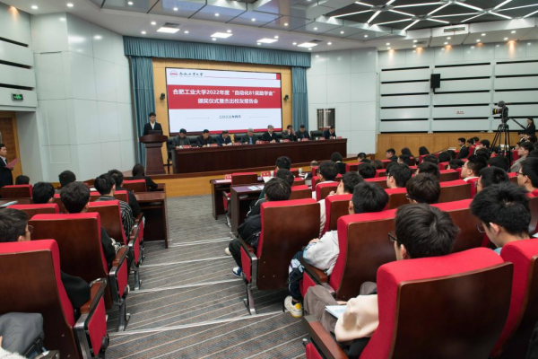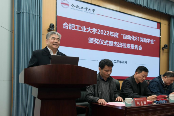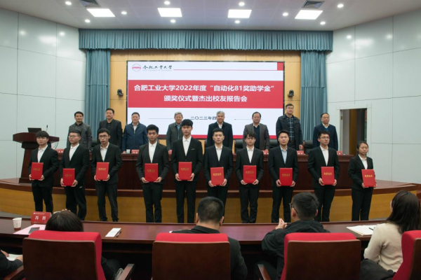 第八届“自动化81奖助学金”颁奖仪式暨杰出校友报告会在学术会议中心一楼大报告厅举行。校党委常委、副校长刘晓平,“自动化81奖助学金”捐赠校友代表、深圳达实智能股份有限有限公司董事长刘磅、蚌埠电子信息产业技术研究院院长邵建强、中国银行蚌埠分行工会主席肖金元、合肥航天液压公司董事长戴林书、合肥华星集团董事长、合肥力宏科技公司董事长冯图等出席仪式,学校校友会办公室、继续教育学院、p站