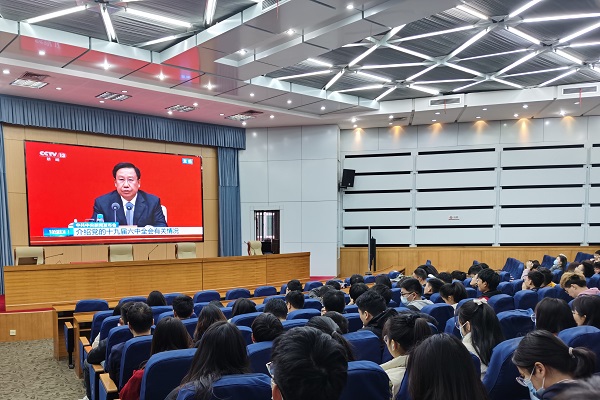11月12日上午,p站 在学术会议中心大报告厅组织第66期预备党员班学员代表和全院学生党支部支委代表收听收看中共中央新闻发布会,学习领会十九届六中全会精神。