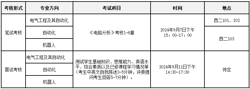 普通全日制本科生转专业管理暂行办法》合工大政发〔2024〕70号),及学校发布的《关于开展2024年合肥校区本科生全校范围内转专业工作的通知》,申请转入电气工程及其自动化、自动化、机器人专业,经学院初审通过的学生,请在教学管理系统中查看笔试时间和地点,并注意以下几点事项: