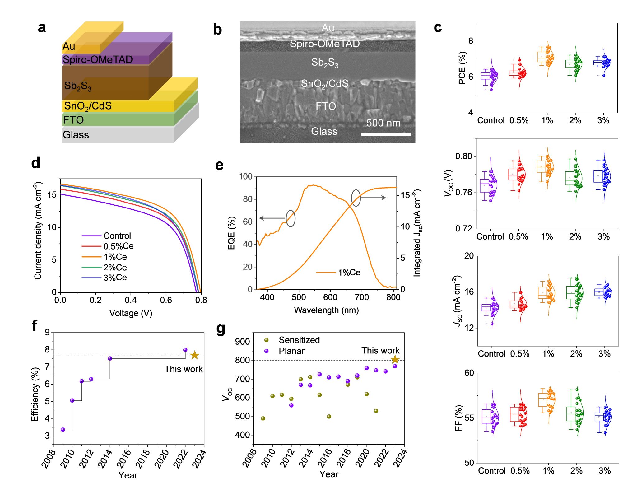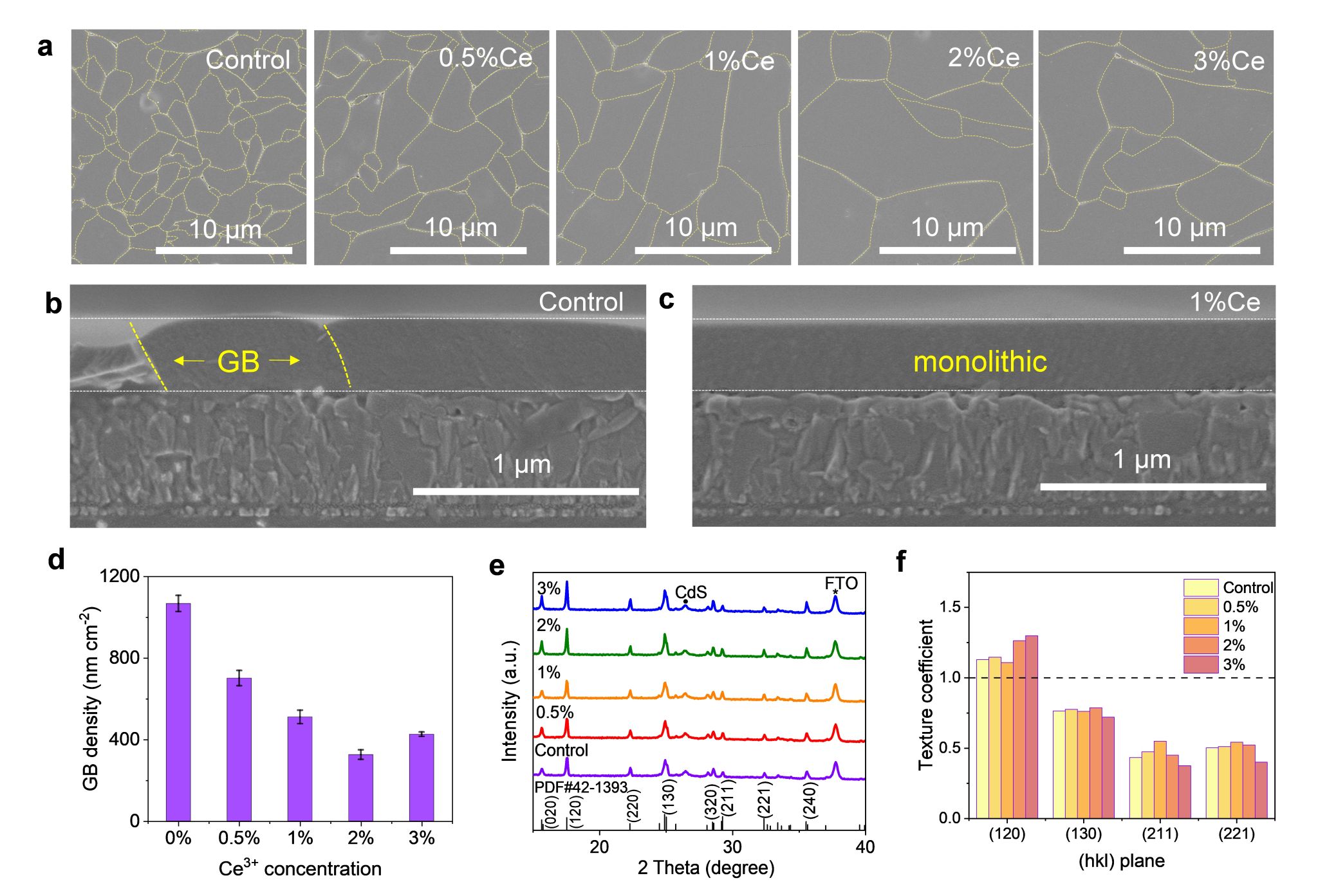 为此,周儒副教授课题组在前期工作基础上(Advanced Functional Materials, 2023, 2308021;Advanced Energy Materials, 2021, 2101923),与中国科学技术大学、牛津大学等单位合作,通过晶粒尺寸调控策略制备了超低晶界密度硫化锑吸收层薄膜,进一步设计构筑了具有低开路电压损失的高效硫化锑薄膜太阳能电池。研究发现,通过在沉积Sb2S3薄膜的前驱溶液中引入适量镧系Ce3+离子,能够实现有效晶粒尺寸调控,所制备硫化锑薄膜最大晶粒尺寸超15 μm,从而使薄膜晶界密度显著降低。通过系统的材料和器件表征并辅以计算讨论,揭示在CdS缓冲层和Sb2S3吸收层界面处形成了超薄Ce2S3层,该界面层能够调控Sb2S3成核与生长,促进薄膜侧向生长,降低薄膜晶界密度;同时,Ce2S3界面层也有助于改善Sb2S3和缓冲层之间的异质结质量。最终,得益于器件内部缺陷态密度降低,有效抑制载流子非辐射复合,显著改善电荷传输特性,制备获得高效平面结构硫化锑薄膜太阳能电池。最佳器件光电转换效率为7.66%,开路电压达796 mV。该开路电压值为目前报道硫化锑光伏器件的最大值。本研究为锑基硫属薄膜太阳能电池研究提供了一种有效的薄膜生长调控策略,其研究思路也可推广应用于其他多晶薄膜光伏材料体系。