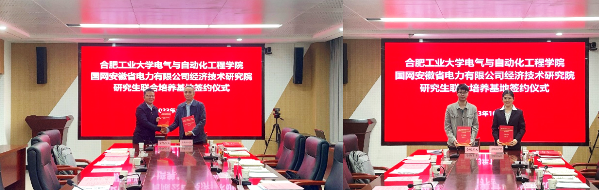 10月12日上午,p站 —国网安徽省电力有限公司经济技术研究院研究生联合培养基地签约仪式暨交流座谈在逸夫楼1009举行。双方将在新型电力系统规划与运行领域的人才培养、发展战略、实验室共享联建及联合技术攻关等方面开展深度合作。