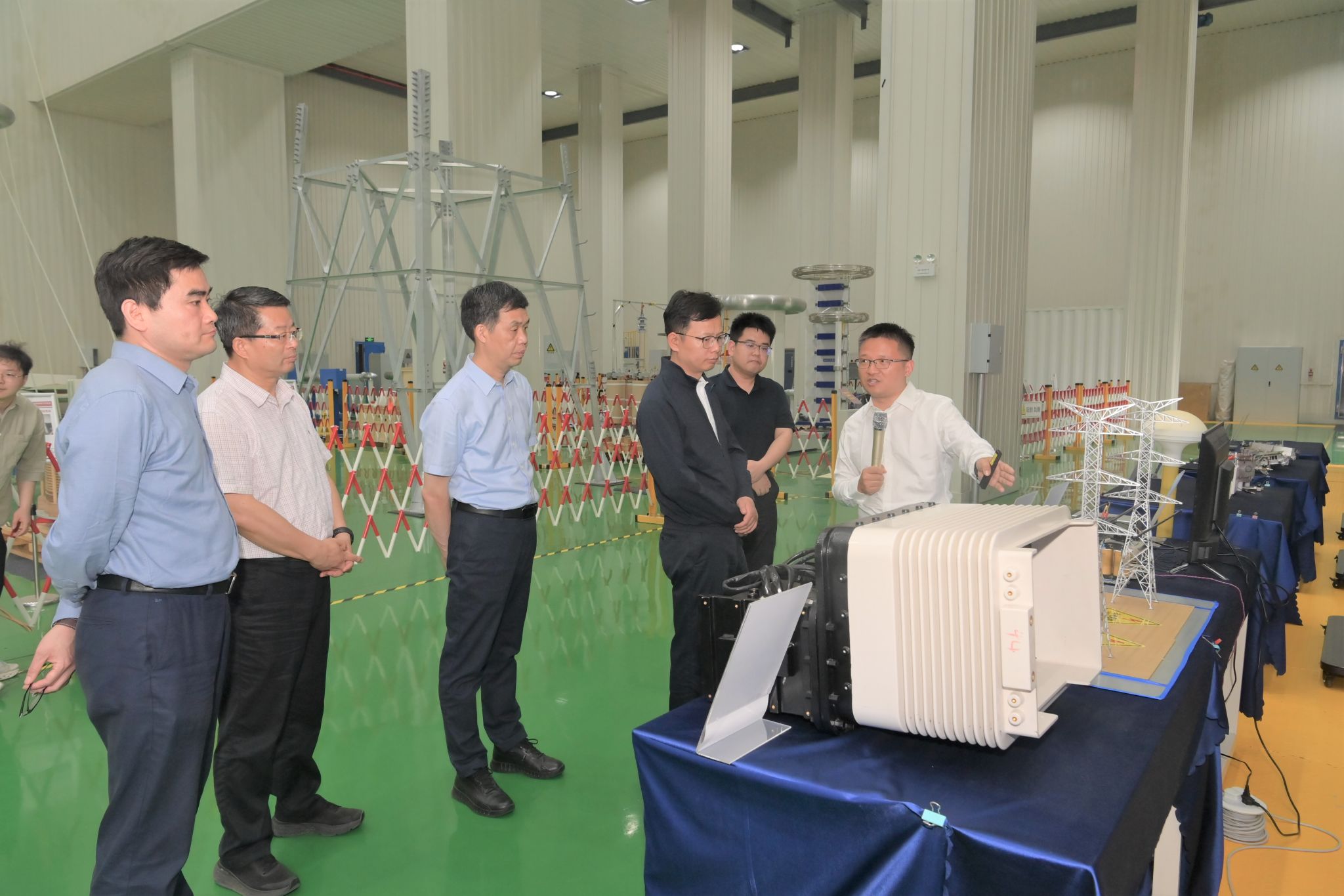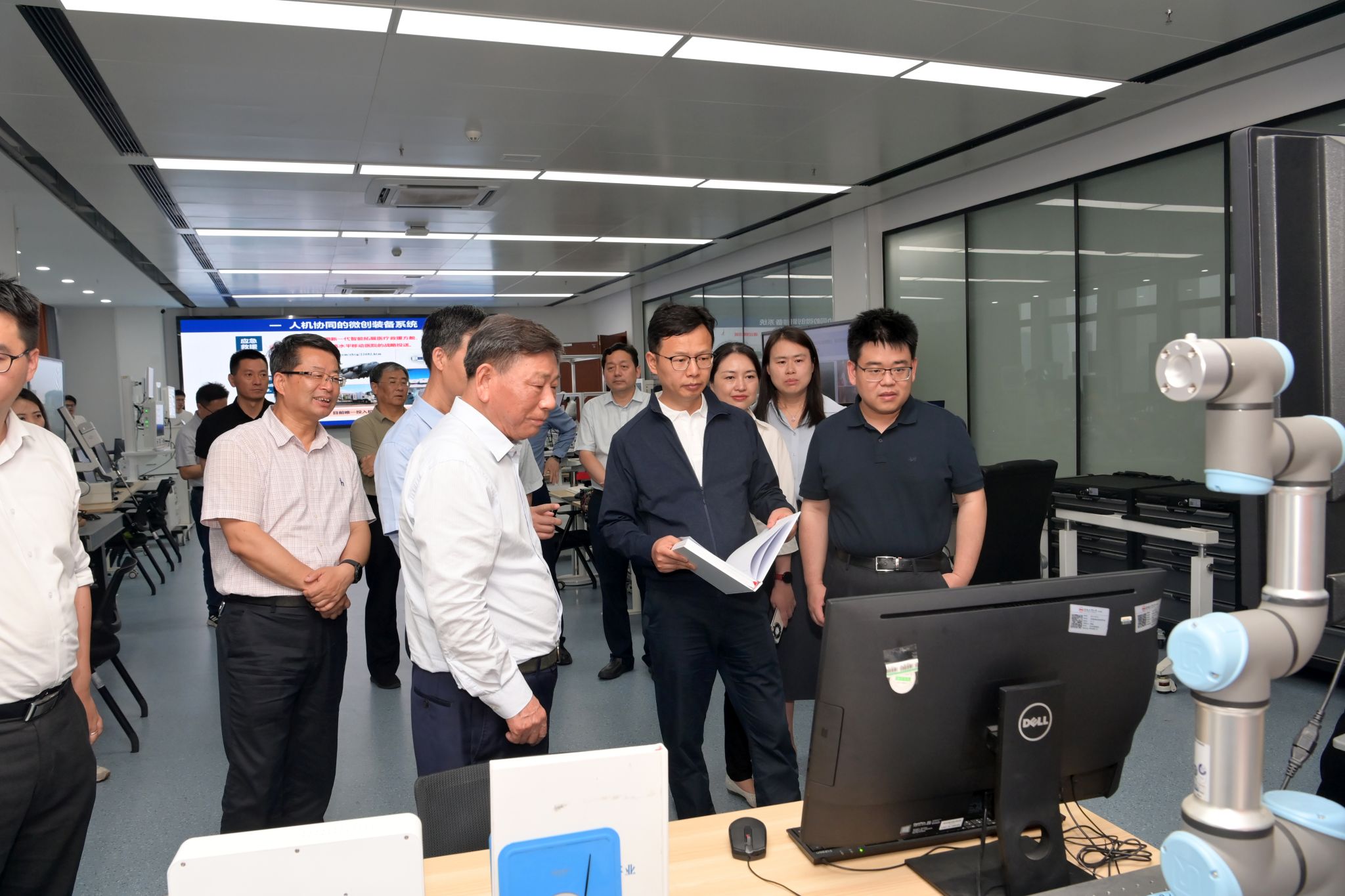 在电能高效高质转化全国重点实验室,赵俊强一行认真听取了科研团队在新能源发电与智慧电力、功率半导体与电力变换、智能测控与新能源汽车、雷电防护与特高压装备等领域的最新研究成果汇报,详细询问相关技术研发原理及应用领域情况,并勉励团队要加强创新能力与产业需求对接,不断提升转化数量、提高转化质量、提速转化效率,以科技创新赋能新质生产力。在工程管理与智能制造研究中心,赵俊强一行听取了杨善林院士关于学校培养拔尖创新人才、推进“双一流”建设等情况介绍。结合展板、实验模型和实验装置,赵俊强参观调研了空天系统智能管控实验室、医疗机器人与智慧医疗健康管理实验室以及智能制造工程管理实验室,对科研团队取得的丰硕成果给予高度评价,并鼓励他们继续瞄准国际科技前沿和国家重大需求发力,加强原创性、颠覆性科技创新,更好服务国家高水平科技自立自强。