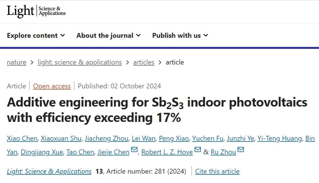 周儒课题组在先进室内光伏技术领域取得最新进展,相关研究成果以“Additive engineering for Sb2S3indoor photovoltaics with efficiency exceeding 17%”为题在线发表于Nature合作期刊《Light: Science & Applications》,该刊为光学领域国际顶级学术期刊。