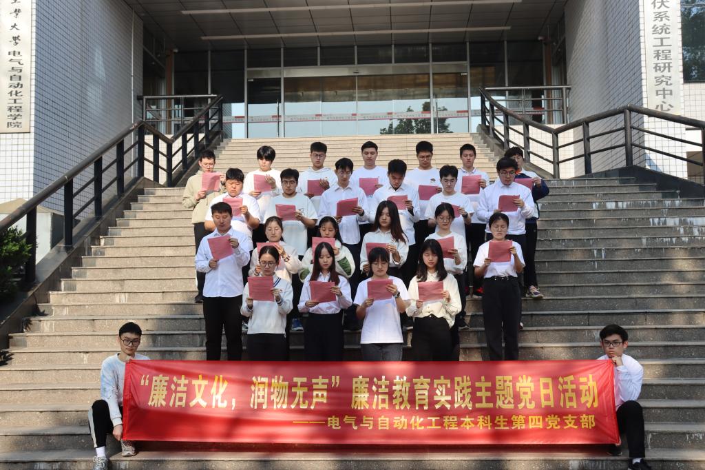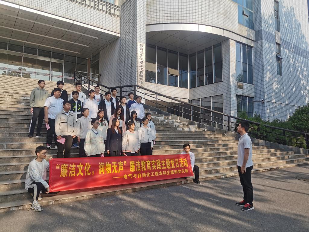 本科生第四党支部全体党员在逸夫楼前开展“廉洁文化,润物无声”廉洁教育实践主题党日活动。