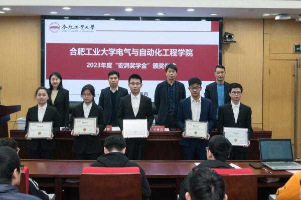 2023年度“宏湃奖学金”获得者的决定》。“宏湃奖学金”获奖学生代表程乐在发言中代表全体获奖学生向宏湃信息技术有限公司以及辛勤培育学生的母校和老师致以诚挚的敬意和衷心的感谢。他表示作为新时代的电气人,要将“工业报国”情怀深深植根于心,肩负起当代大学生的责任,矢志不渝坚持理想,不负母校培养,为国家、社会和电力行业的发展贡献工大学子的青春力量。