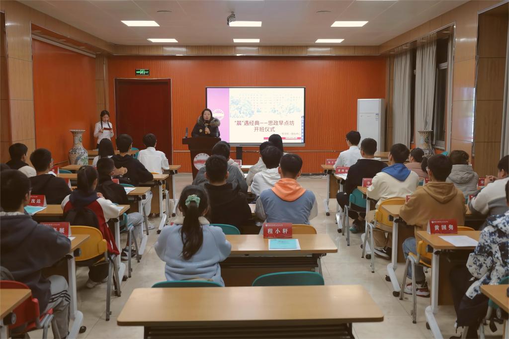 在第二宣讲厅举行“晨”遇经典思政早点坊开班仪式,学院相关负责人、党团班一体化中心全体成员、辩论队骨干和早点坊第一期学员参与仪式。