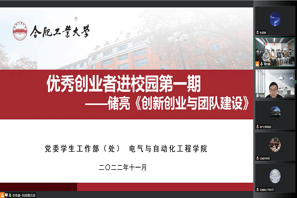 承办的“优秀创业者进校园”第一期创新创业专题报告会采取线上线下同步收听的方式在屯溪路校区学生公寓五号楼大学生成长社区开展,报告会诚邀学校2005级电气工程及其自动化专业校友储亮先生为全校各学院2023届毕业生作创新创业方向的指导交流。