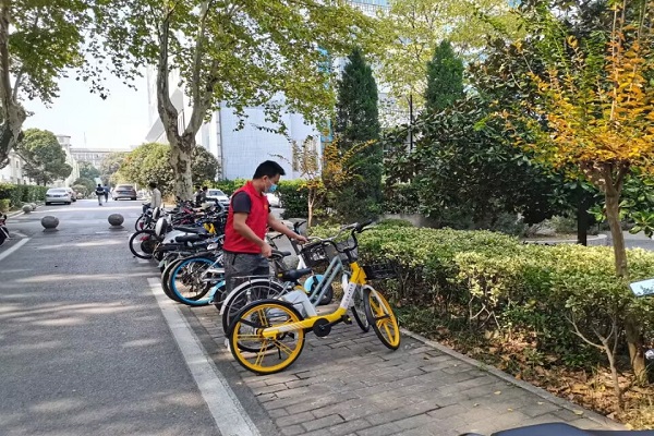 志愿者们认真的把停放“无序”的电动车和自行车逐辆摆放整齐