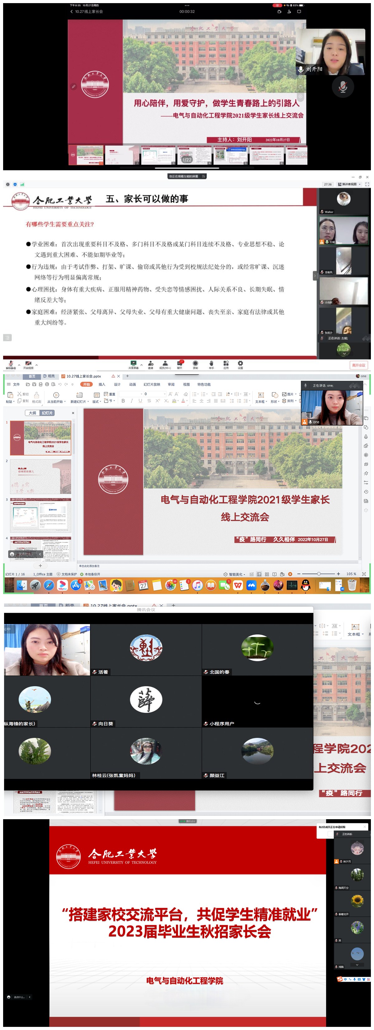 各年级辅导员老师向家长分析了当前复杂多变疫情防控形势,解读了现阶段教育部、安徽省、合肥市和学校疫情防控政策,重点介绍了学校学院疫情防控工作实施方案,包括离返校的管理、宿舍区域的管理、教育教学活动的实施、学生健康管理、学校学院关心关爱等,建议家长加强与学生沟通交流,引导学生增强大局意识,理解支持学校的各项疫情防控制度,按时参加线上课程学习,坚持每日做好核酸检测和健康状况报告等工作,并向家长普及了疫情下大学生常见的心理困惑、调适方法和学校开展的心理关爱等活动,号召家长关心孩子在线学习情况,督促孩子保持良好作息,勠力同心抗疫,齐心守护彼此,关爱每位学生。