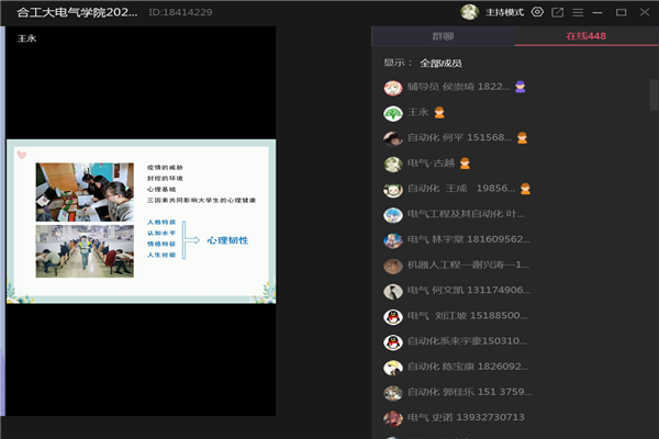 讲座中,王永以专业心理韧性知识为切入点,结合自身讲述了在疫情下心理韧性的作用机制,并分析其产生的原因。讲座通过列举研究数据,分析心理韧性的发展途径,解释有关研究结论,举例了包括生理反应、心理反应、行为反应三个方面在内的身心不良反应,并给出了“发现快乐美好”“不断创造价值”“积极表达意愿”“反思总结经验”“注重生活实践”五种培养大学生心理韧性的策略。他认为大学生可以通过书写表达技术和幸福树绘画技术等培养自身的心理韧性,适应不断变化的环境。王永老师语言幽默风趣,讲座内容丰富,理论与实际相结合,同学们通过线上平台与王老师实时互动,获益颇丰。