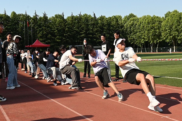 最后一项拔河比赛,随着一声鸣笛,两队队员紧握着绳索,一个个脚踏着地面,身体向后倾斜,拼命拉住绳索。绳索中央的红色绸带,时而向左,时而向右。两方啦啦队的队员,齐声呐喊,不停为自己的队伍鼓掌助威。二十六支队伍的对决,有一瞬间倾倒的碾压局,也有反败为胜的翻盘局。为了团队荣誉,队员一个个咬牙切齿,咧着嘴大叫,还有一些人双手紧握着绳子,把自己的脸挤得通红。在一根麻绳上凝聚着三十人的力量和意志,此时此刻,输赢已不重要,尽力便是最好的成绩。经过四轮小组赛角逐,拔河比赛由本科生2020级代表队力压群雄夺得第一名。
