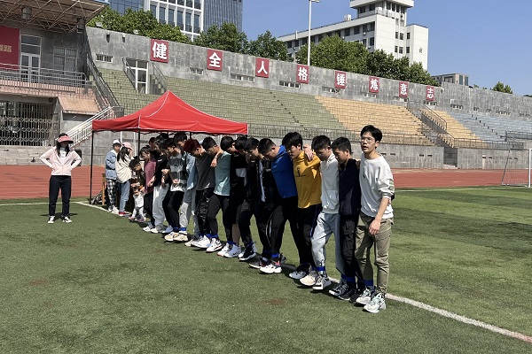“两人三足”项目中,要求参赛的15名队员将自己与相邻队友的脚绑在一块,组成十五人十六足的队伍一起通过50米的赛道,最终根据用时长短进行排名。赛场上,口号声呐喊声此起彼伏,热血和激情如同炽焰燃烧了整个运动场。“一二一,一二一”整齐的口号声带动着每一位参赛队员,他们心里只有一个目标就是一起冲向终点,十五人在仅仅二十米宽的赛道里,一往无前。最终本科生2020级代表队夺得第一名。