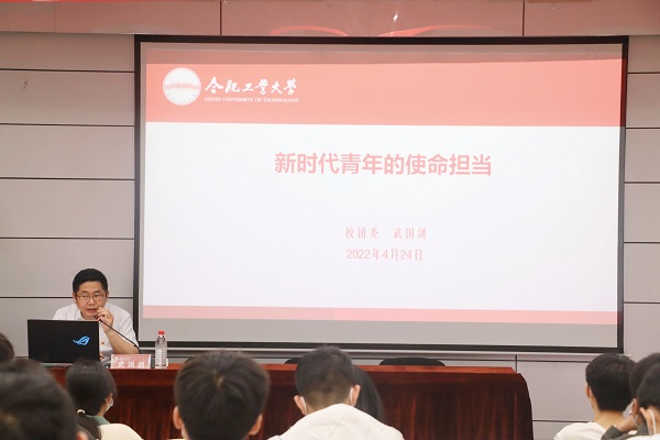 典礼结束后,校团委书记武国剑为大家讲授了题为《新时代青年的使命担当》团课。武国剑用网络流行语作引,从介绍时代、中国共产党和青年三者之间的关系展开,详细介绍了新民主主义革命时期、社会主义革命和建设时期、抗美援朝时期、改革开放时期以及党的十八大以来的典型青年运动,为全体学员展现了一部生动鲜活的青年运动史。团课中他提出新时代青年要有革命理想高于天的坚定信仰、打铁还需自身硬的扎实本领、撸起袖子加油干的奋斗精神、敢叫日月换新天的创新品质和甘为真理付韶光的奉献意识的五点品质。最后他总结到“青年要传承优秀传统文化基因,不负党和人民的期待,响应新时代的召唤。青年一代有理想、有本领、有担当,国家就有前途,民族就有希望。”