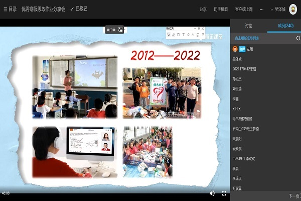 伍钰婷讲述了《手写新春对联,共赏书法之美》《书写心声,助力冬奥》《手绘蜡染,传承技艺》3份视频作业的过程,向同学们展示了中华传统工艺的魅力;许经伟分享了和同学一起参观蜀山烈士陵园,重走延乔路的历程和心得体会,用视频作品深切缅怀了陈延年和陈乔年两位烈士;“爷爷打来电话告诉我最近的近况,后山那片土壤重新又在开花”,胡博现场播放了他的原创摇滚歌曲《盛开的花》,动听的旋律和节奏感染了在场师生,其另一首原创说唱歌曲《并肩》表达了全国人民上下一心抗击新冠疫情的决心,在歌声中同学们被中华民族众志成城共克时艰的伟大民族精神深深感动;吴泽城讲述了自身在寒假期间积极投身返校宣讲活动助力家乡高三学子冲刺高考,同福建省永春第一中学的学生们交流的经历和感悟;李昕翰以视频的形式展示了发生在电力行业发展领域的典型事迹与感人瞬间,通过一段对江苏省连云港市供电公司电力调度控制中心地区监控班班长罗俊同志的采访片段,展现了电气行业党员的的责任和担当。
