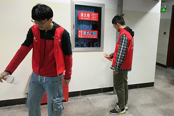 研会志愿者们对研究生公寓开展全面清洁消毒活动。