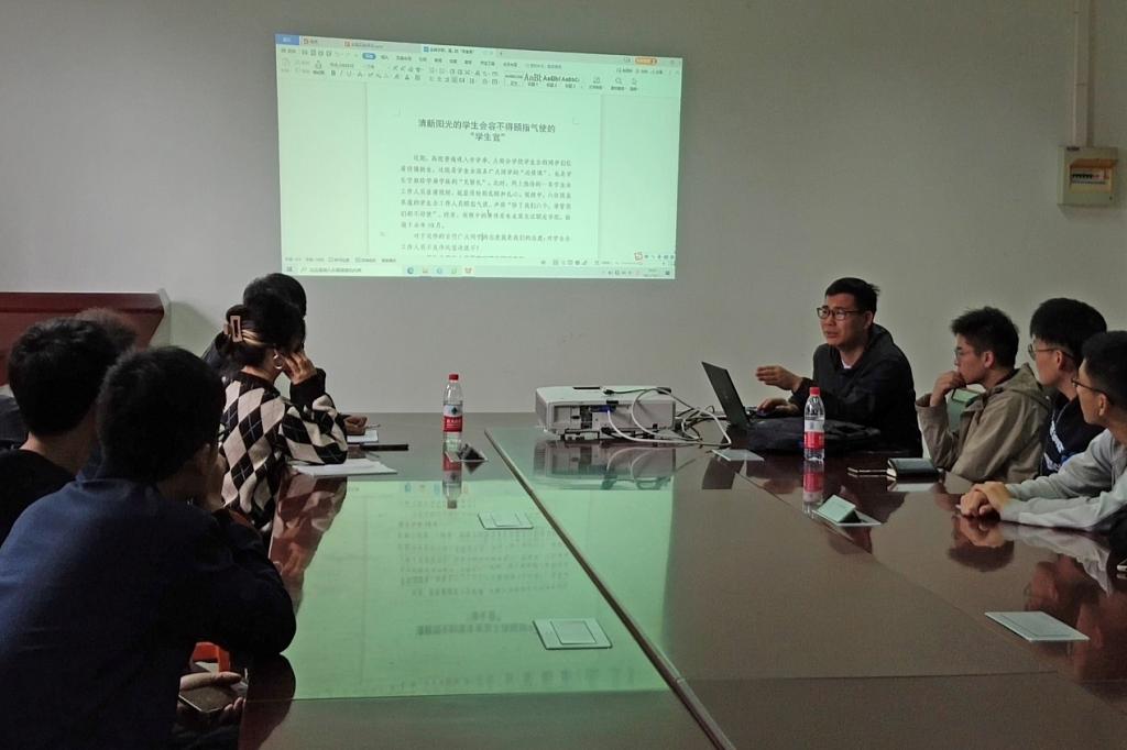 会上,辅导员闫志伟就研究生会的思想、作风建设问题进行了主要发言,并与在场的研究生会负责人进行了深入讨论。辅导员闫志伟带领参会人员一起学习了习近平总书记关于青少年学生成长的重要论述摘编、共青团中央办公厅与全国学联下发的一系列相关学习文件,并结合p站