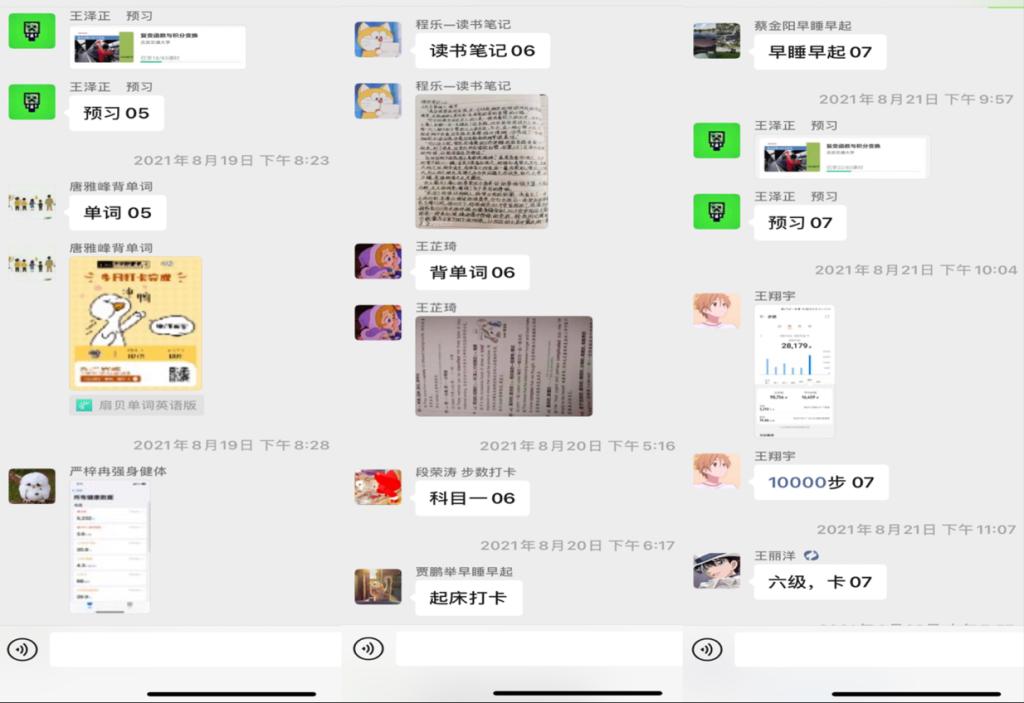 活动中,每位同学自行选择一项小目标,坚持14天在班级微信群内打卡,将每日记录以照片或截屏的形式向大家分享,如:照片+每天步数15000步+打卡1天,坚持14天及以上的同学可以获得一份小奖品。班级共30余位同学参与活动,累计打卡近400次。同学们根据暑假计划制定了各自的正能量“小目标”:有的同学坚持每日背诵英语四六级英语单词;有的同学坚持跑步、骑行、跳绳等体育锻炼;有的同学坚持阅读和写作或练习厨艺,14天后为家人做出一桌美味佳肴......暑假期间,同学们互相监督并交流心得体会,线上拉进了同学们间的距离。