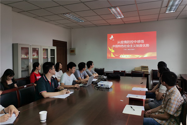 经前期讨论准备,全体党员就主题进行分组讨论汇报。韩屹首先以“中国特色社会主义的发展过程及内容”为主题,从“邓小平理论”,“三个代表重要思想”,“科学发展观”,“习近平新时代中国特色社会主义思想”这四个部分向大家详细讲述了中国特色社会主义的发展历程,让党员同志们感受到中国的发展亦伴随着中国特色社会主义的发展。之后,魏定生和乔一达同学结合自身经历,以他们对中国特色社会主义制度优势的感受为主题,结合当前时事,即抗击新冠疫情,从6个方面讲述了中国特色社会主义的优势。会中,支部书记马意超,以自身作为p站