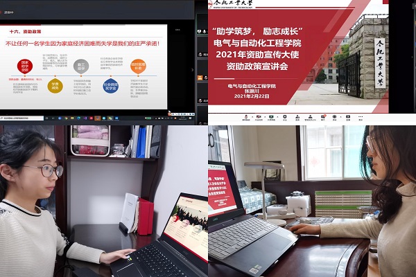 寒假期间,学院积极动员20位国家奖学金获得者全员担任资助大使,利用寒假学生返乡这一契机,引导和组织开展资助政策“云宣讲”,受益面覆盖1000余名家乡中小学生。17级自动化专业葛笑同学针对母校学生开展线上资助政策解读;电气专业闫兴园同学和家乡学生讲述了自己在国家和学校资助政策下自强进取、安心学习的经历,并建立qq群,将大学生资助政策文件分享给母校学生,并开展一对一交流,帮助他们化解后顾之忧。17级智能电网专业葛晓璐同学有感而发:“我们受益于国家资助,自当常怀感恩之心,用心去传播爱的种子,在他人需要帮助之时,传递关怀和温暖。”