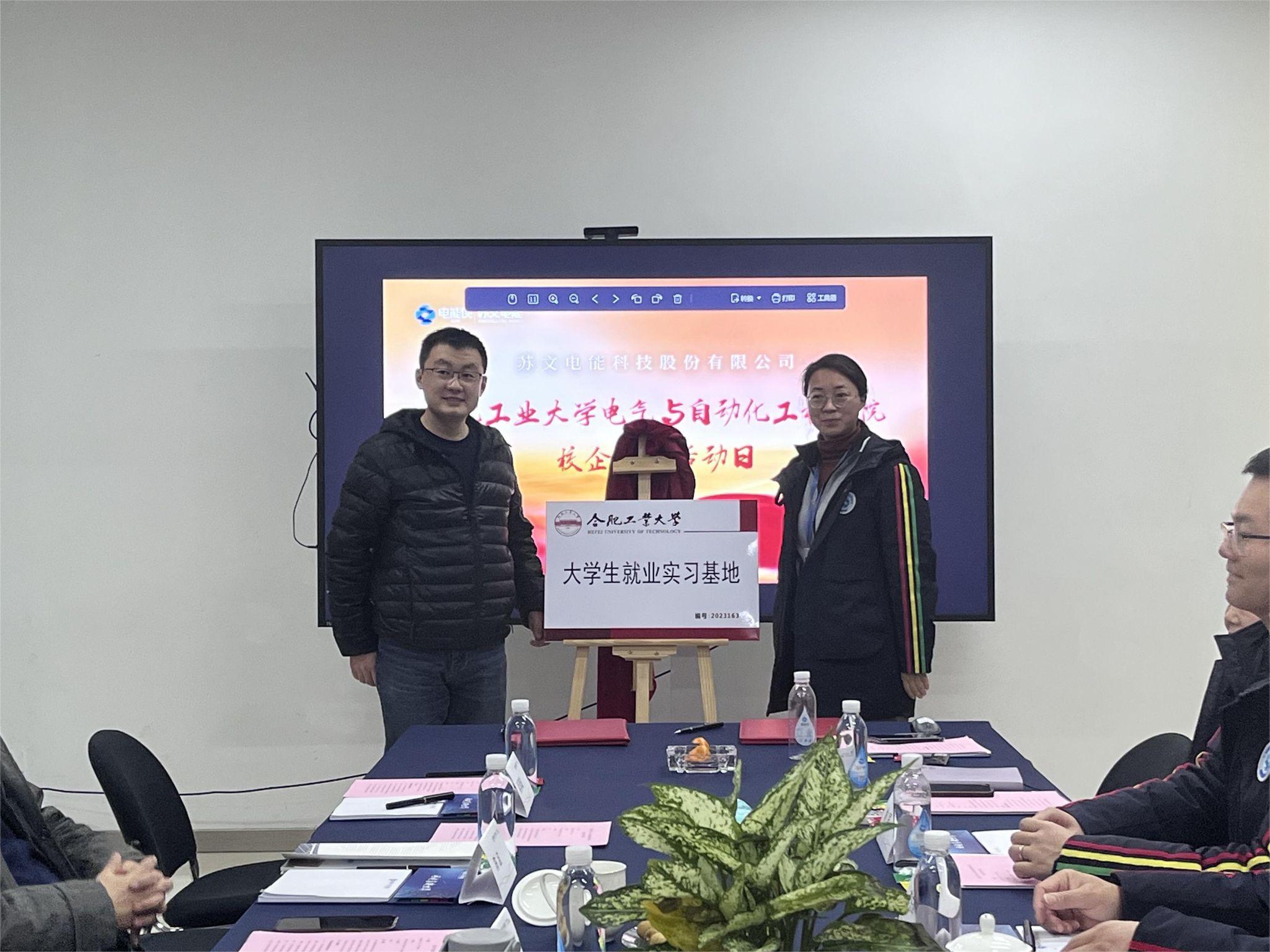 大学生就业实践实习基地协议,符君与孙伟共同为大学生就业实习基地揭牌。双方就就科研项目合作、人才招聘、实习基地共建等方面内容进行深入座谈。