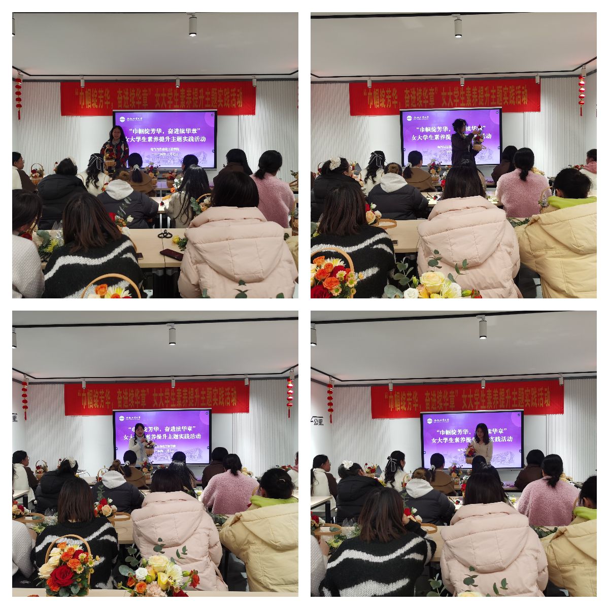 “她”风采环节,同学们先后上台展示自己制作的花艺作品,介绍作品的寓意,表达自己对未来的期待和向往,以花抒心,以花明志。电气22-3班邵祺鸣同学分享了她的作品《时光》,“《时光》正面花团锦簇,五彩斑斓,象征我们多姿多彩的青春年华,繁花似锦意味着我们拥有无限的可能。作为新时代的女大学生,我们要把握机会,增加阅历,韶华不为少年留,且怀抱理想,绽放芳华。《时光》侧面色调以酒红、暗粉为主,象征我们经历时光的沉淀,渐渐成长。寓意我们要不负韶华、竞相绽放,努力成长为堪当民族复兴重任的时代新人。”《鲜花竞放》、《天真烂漫》、《巾帼风采》等作品随后一一展示,寄托着学生对学习生活的真诚热爱,对美好前程的美好期许,对报国志向的远大追求。