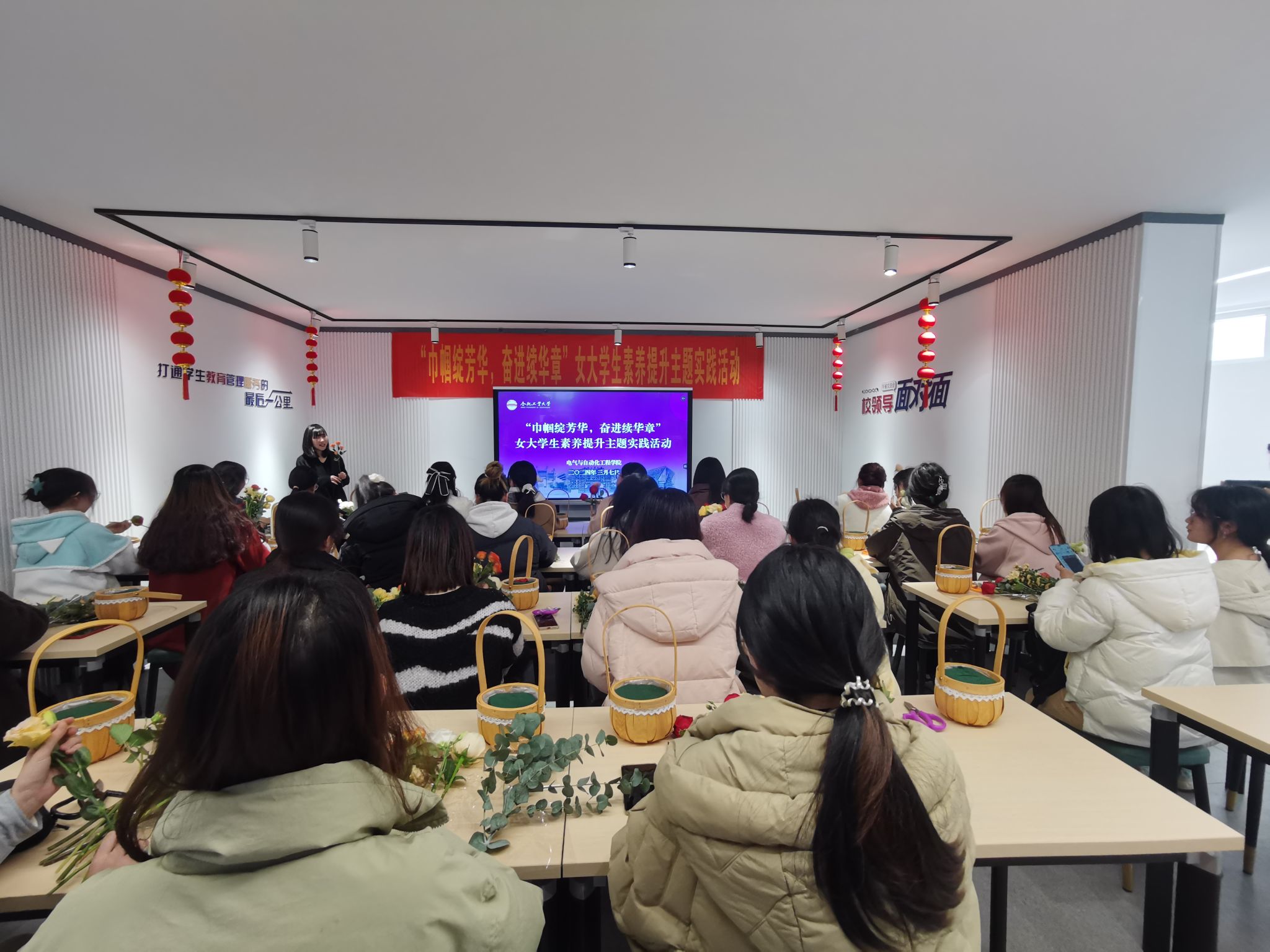 在屯溪路校区七号楼学生社区沙龙空间开展“巾帼绽芳华,奋进续华章”女大学生素养提升主题实践活动,学院党委相关负责人、辅导员代表、30余名各年级女生代表参加活动。