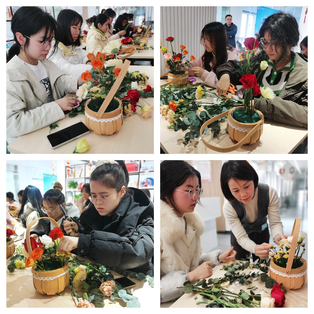 “她”绽放环节,杨老师带领同学们动手实践,开展花艺制作,她介绍了花道的相关知识,插花的艺术特点及作用。从花材的选择,色彩的搭配到造型的构思,为同学们进行了系统的指导。同学们根据自己的喜好挑选花材,在颜色与搭配上别出心裁,根据花朵的寓意和个人对美感的追求,将精心挑选的玫瑰、百合、茉莉等花束组合成一幅幅独特的艺术作品。有的作品清新淡雅,有的作品热情洋溢,有的作品意蕴深长,活动现场氛围活跃,同学们相互分享体验感受,并为自己的作品命名。
