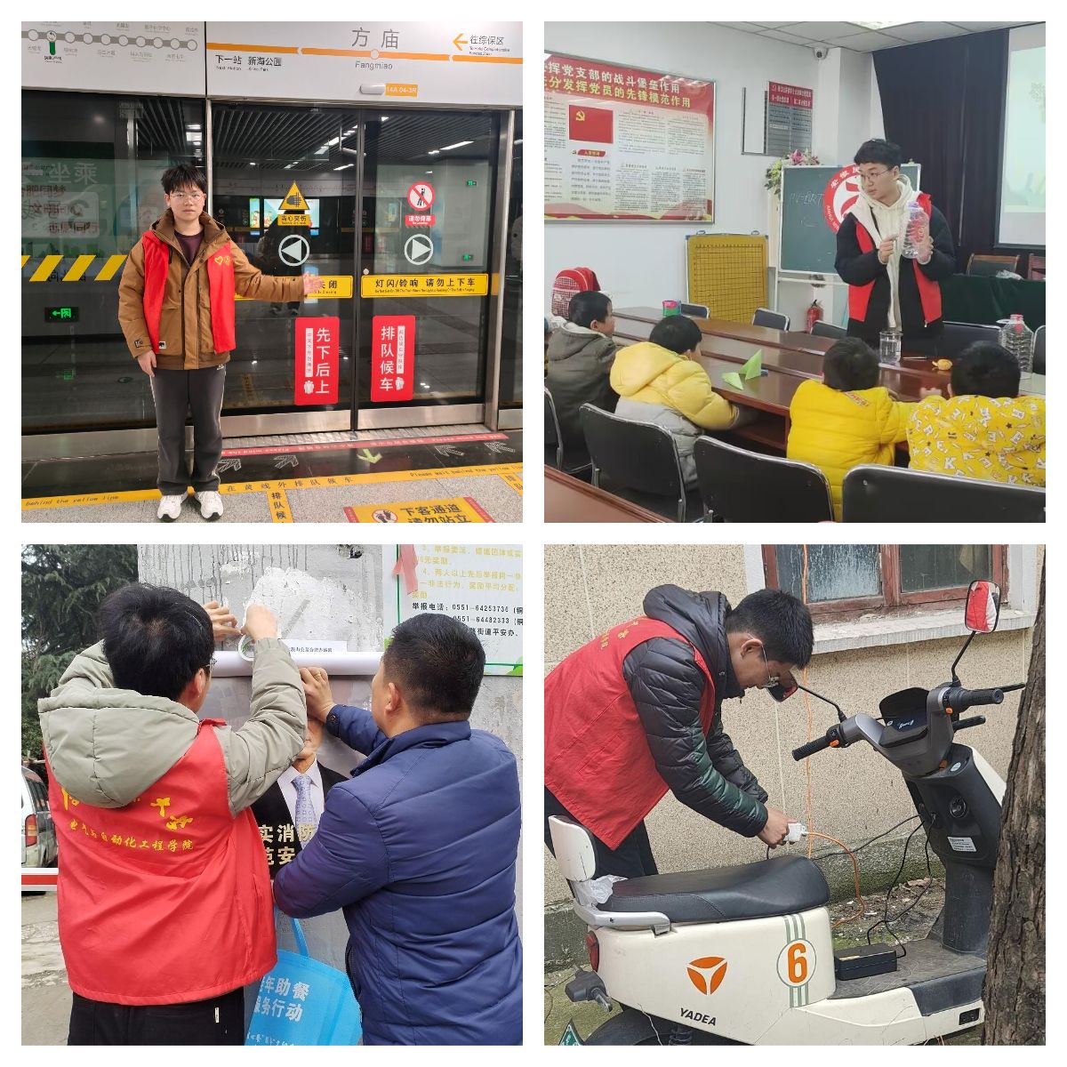 “熠”起守望,基层治理。3月5日,学院志愿者赴方庙地铁站开展志愿服务活动,引导乘客有序出入,维护站台秩序,为轨道交通安全运行贡献青春力量。3月6日,志愿者深入塘西河社区开展便民服务与消防安全宣传志愿服务活动,他们深入居民家中调研用户需求,为社区老人提供力所能及的帮助,同时在社区现场为居民提供免费理发、测视力、量血压等便民服务,助力营造和谐、幸福的社区氛围。为保障居民生活安全,提升消防安全意识,志愿者在社区开展“消防安全课堂”主题志愿活动,向社区居民普及消防安全知识,讲解电动车充电产生火灾隐患的严重后果,张贴“警惕电动车自燃问题”宣传海报,发放消防安全宣传单,对居民进行消防安全宣传教育,与社区工作人员一起开展社区安全大检查,对电动车不规范充电、私拉电线等安全隐患及时发现,及时处理,防患于未然,为构建安全和谐社区保驾护航。