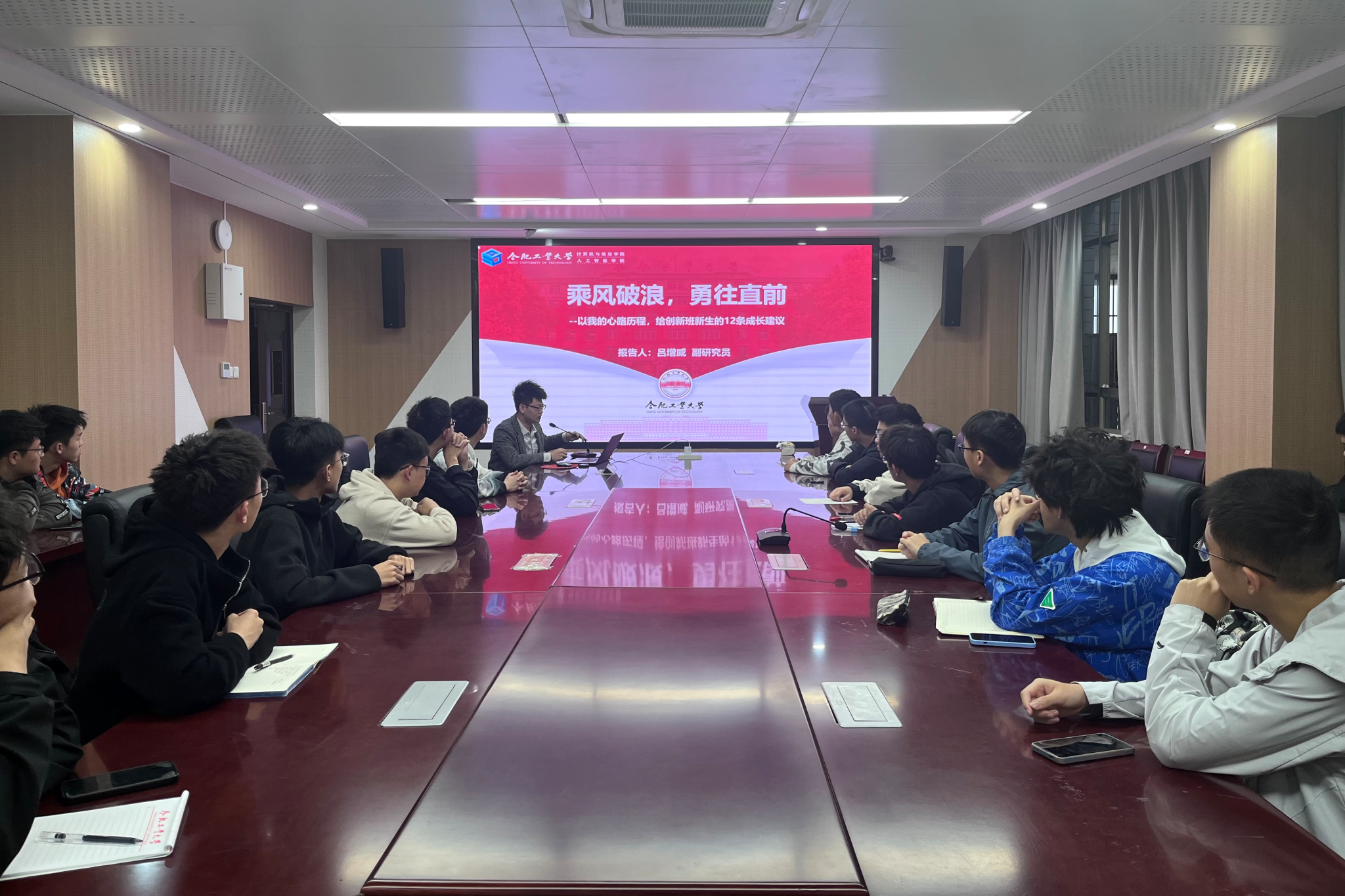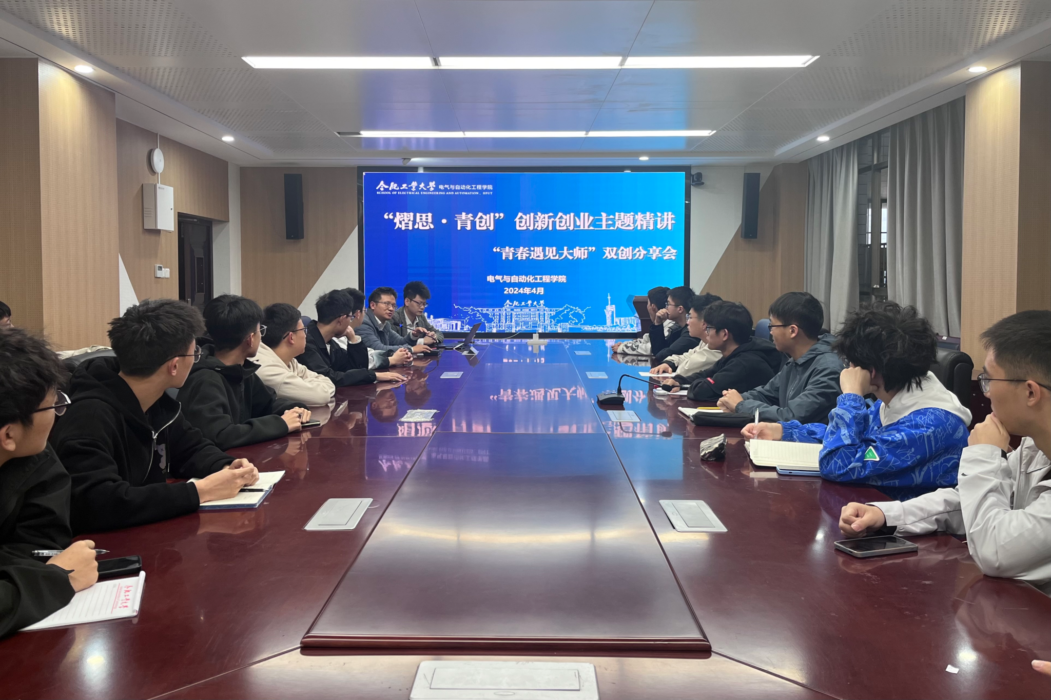 “青春遇见大师”双创分享会之“熠思·青创”创新创业主题精讲于逸夫楼1009会议室组织开展,计算机与信息学院吕增威副研究员受邀主讲,学院党政相关负责人、电气工程及其自动化2023级创新实验班全体学生参加活动。
