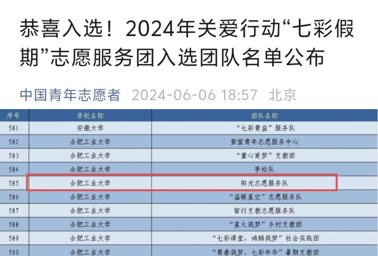 本次活动是为深入学习贯彻习近平新时代中国特色社会主义思想和党的二十大精神,切实加强对农村留守儿童、寄宿儿童、困境儿童等少年儿童群体的关心关爱,组织动员青年志愿者以实际行动投身中国式现代化建设,活动得到了各高校志愿服务团队的广泛关注和积极参与。主办单位对所有申报材料进行了认真审阅,最终来自全国1167所高校的2000支大学生志愿服务团队入选。学院高度重视儿童关爱志愿服务工作,打造‘熠’路童行、‘熠’伴成长等多个志愿服务品牌,多次组织志愿者利用寒暑假期深入社区、中小学、贫困山区学校开展儿童关爱志愿服务活动,涵盖科学小实验、文明风尚宣讲、多彩手工课堂、学业辅导、趣味运动会等多种形式,突出生命安全教育、节能环保宣传、防范校园欺凌等多个主题。聚焦困境儿童身心健康发展,为儿童成长提供暖心服务,营造关注儿童、关心儿童、关爱儿童的良好氛围。本次入选的“阳光志愿服务队”10名成员志愿经验丰富,积极参与儿童关爱志愿活动,表现优异,志愿服务时长累计1500余小时。团队多次利用寒暑假期和课余时间深入社区、中小学、乡村开展儿童关爱志愿服务活动,团队成员多次荣获校级奖励荣誉。