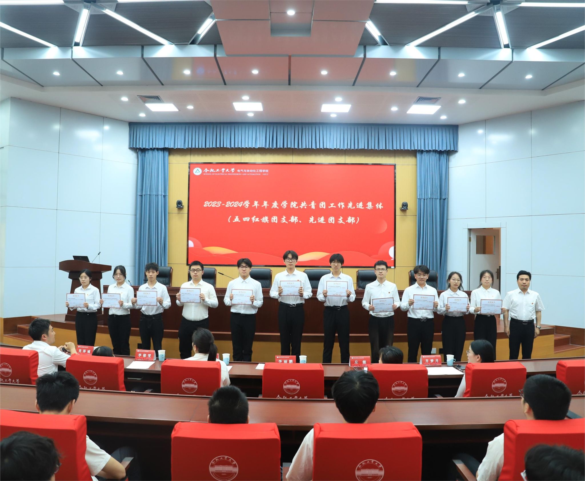 2023—2024学年五四表彰大会暨“辉熠·青年”青春故事分享会在屯溪路校区学术会议中心一楼大报告厅举行。学院党委相关负责人、学院团委相关负责人及200余名团员代表参加大会。