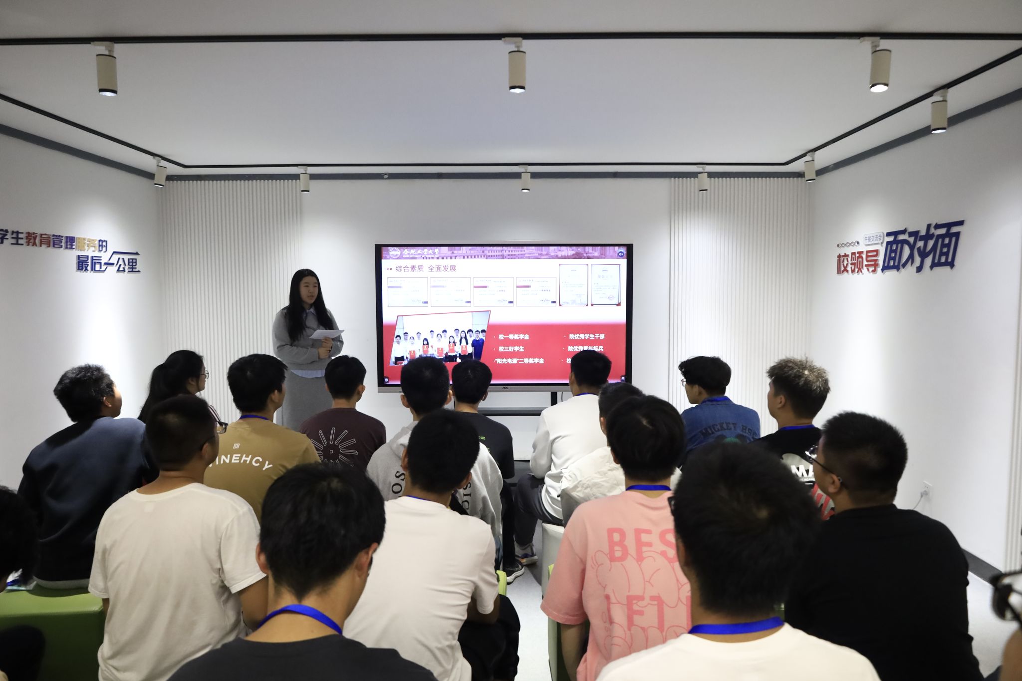 于七号楼沙龙空间开展“青春遇见榜样”迭兴思享荟之“熠言·青程”党员先锋主题精讲活动,2024年校十佳大学生党员王宇清主讲。