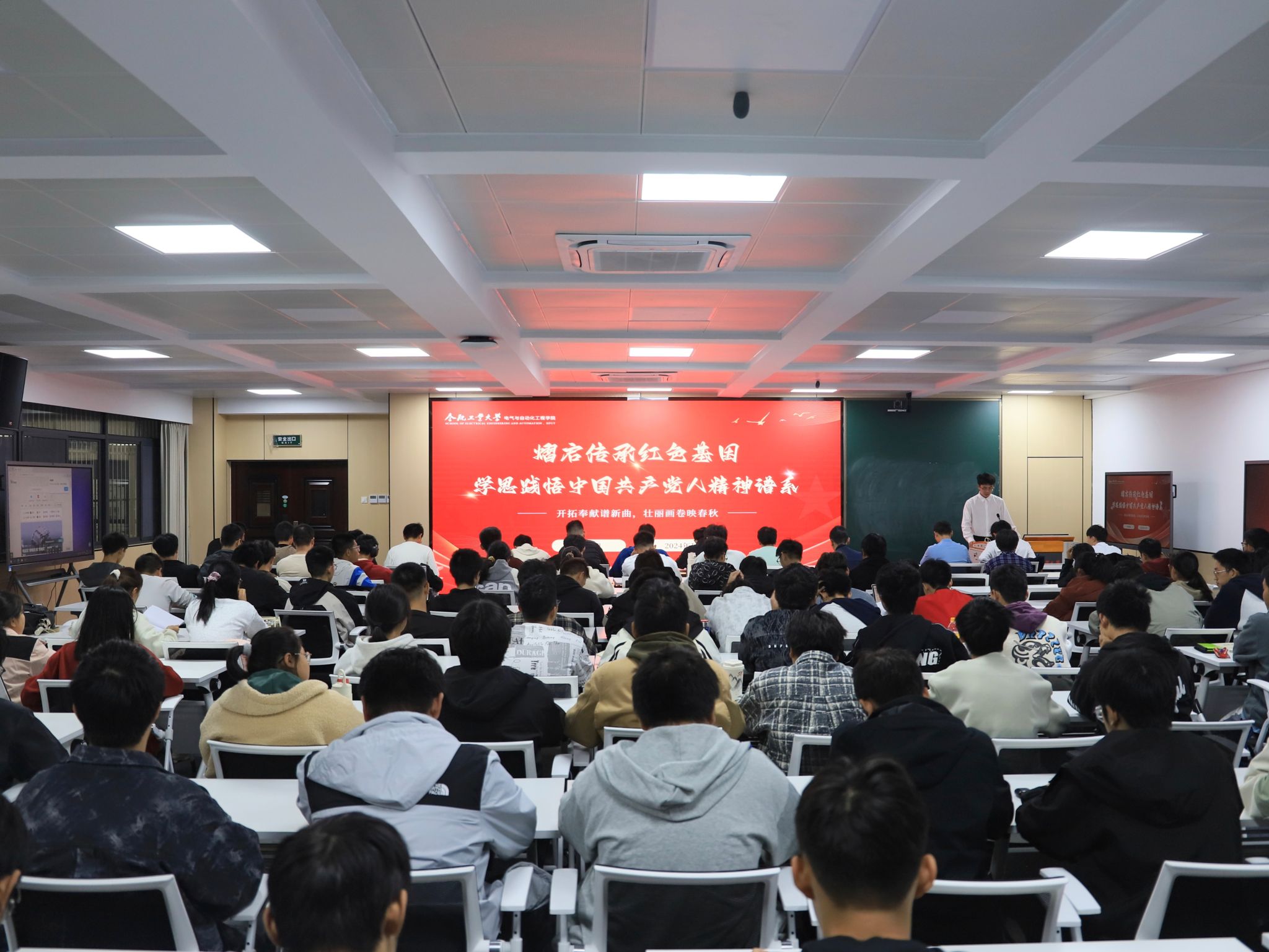 于逸夫楼1005会议室开展“开拓奉献谱新曲,壮丽画卷映春秋”主题宣讲,学院“熠启传承红色基因、学思践悟中国共产党人精神谱系”宣讲团成员李佳峻、杨行行、章贝兆、朱国庆深情讲述了脱贫攻坚精神、五四精神、北大荒精神、兵团精神,学院相关负责老师、团学组织负责人、电气工程及其自动化专业2024级学生参加学习。
