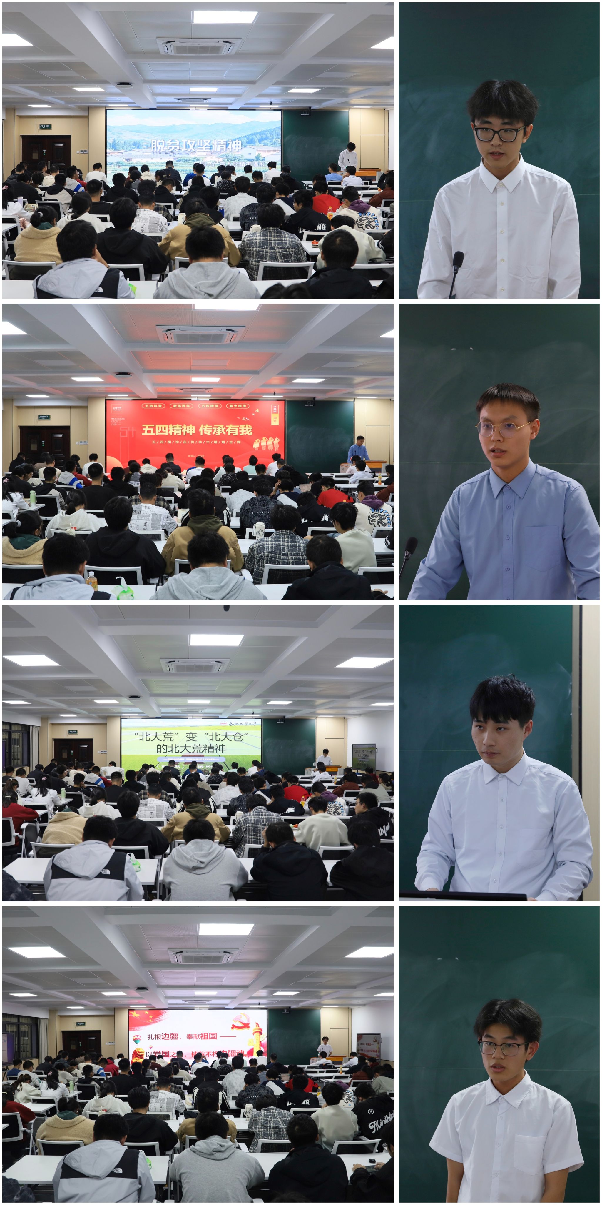 李佳峻以《脱贫攻坚精神》为主题,围绕形成背景、发展阶段、科学内涵、时代价值和实践案例深入剖析,勉励同学们在求学路上面对挑战与困难,要自强不息,勇于探索,不断突破自我,振兴中华不仅是时代的召唤,更是我们每个人用行动去书写的故事,激励着我们为实现中华民族伟大复兴的中国梦贡献青春力量。杨行行以《五四精神,传承有我》为题,从五四精神的定义、历史意义、时代内涵、青年使命以及我们应如何面对时代大任等方面展开论述,呼吁同学们大力弘扬五四精神,从前辈的事迹中寻动力,对标先进,竭尽全力为建功新时代奋斗。章贝兆以《“北大荒”变“北大仓”的北大荒精神》为题,以作家《北大荒歌》作品为引,回顾了北大荒沃野千里、人迹罕至的情景,并结合生活实际激励同学们积极践行“北大荒”甘于奉献的精神内核,不怕吃苦,刻苦钻研,在日常生活中养成勤俭节约的生活习惯,学习和科研中关注电气领域的前沿技术,积极参加电气相关的创新实践活动,践行开拓创新的时代要求。朱国庆以《扎根边疆,奉献祖国》为主题,讲述了“祖国在我心中,边疆在我脚下”的深厚内涵,勉励同学们牢记使命、敢于担当;无私奉献、甘于付出;艰苦奋斗、勇于创新;锐意进取、不断发展,以兵团精神为指引,以更加饱满的热情和更加坚定的信念,投身到新时代的伟大事业中去,共同创造更加美好的未来。