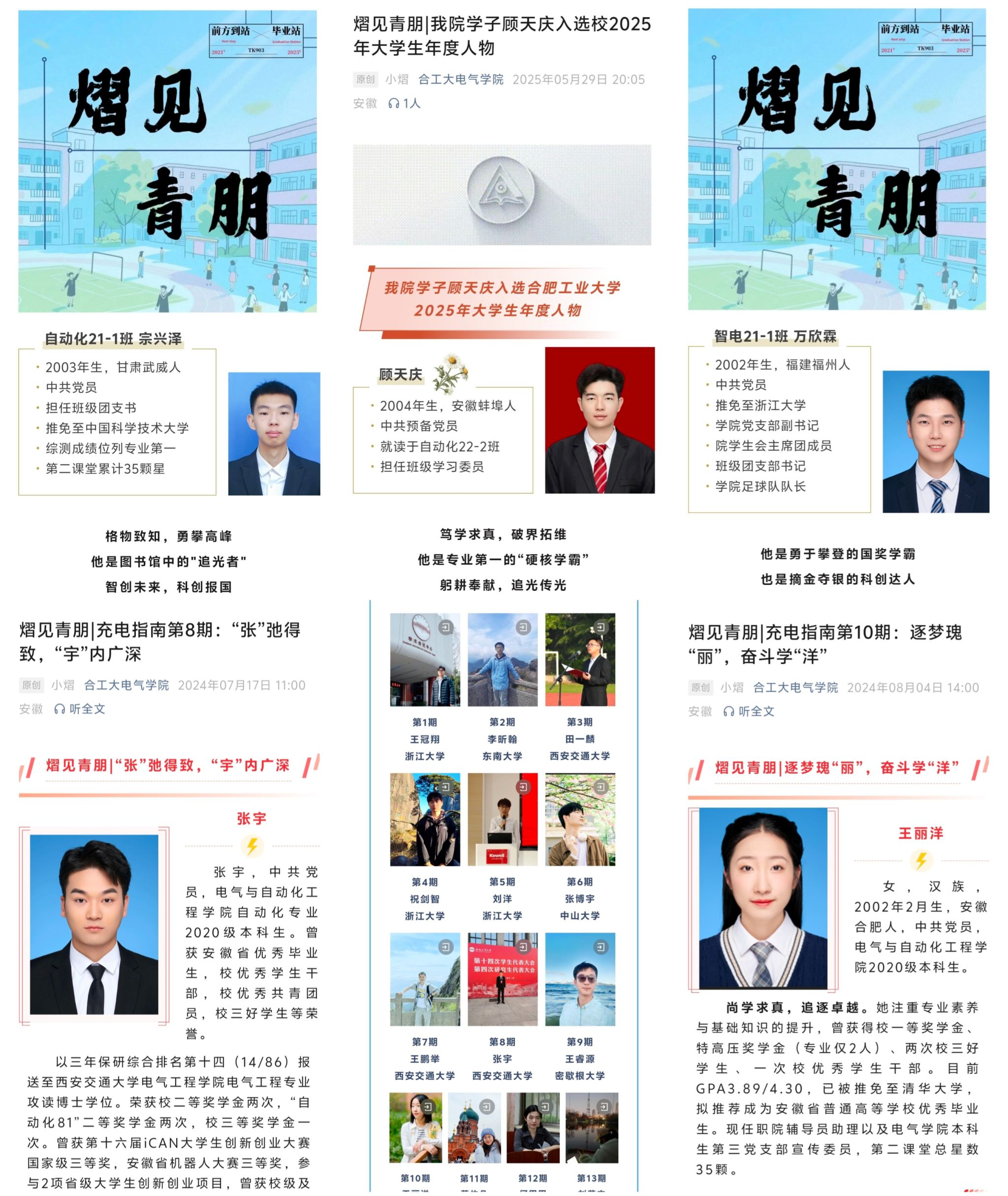 组建学生骨干成立“三色教育”宣讲团,获批团中央“美丽中国·青春行动”2024年绿色长征科考实践团队,并获优秀实践成果(全国仅40个)、2024年安徽省暑期“三下乡”优秀实践团队,编制创排舞台剧入选教育部2025年“科学家故事舞台剧推广行动”公示剧目,产出作品获教育部“读懂中国”活动优秀微视频、“双百”科普大赛特等奖、“视廉正行”廉洁教育视频特等奖等荣誉多项。