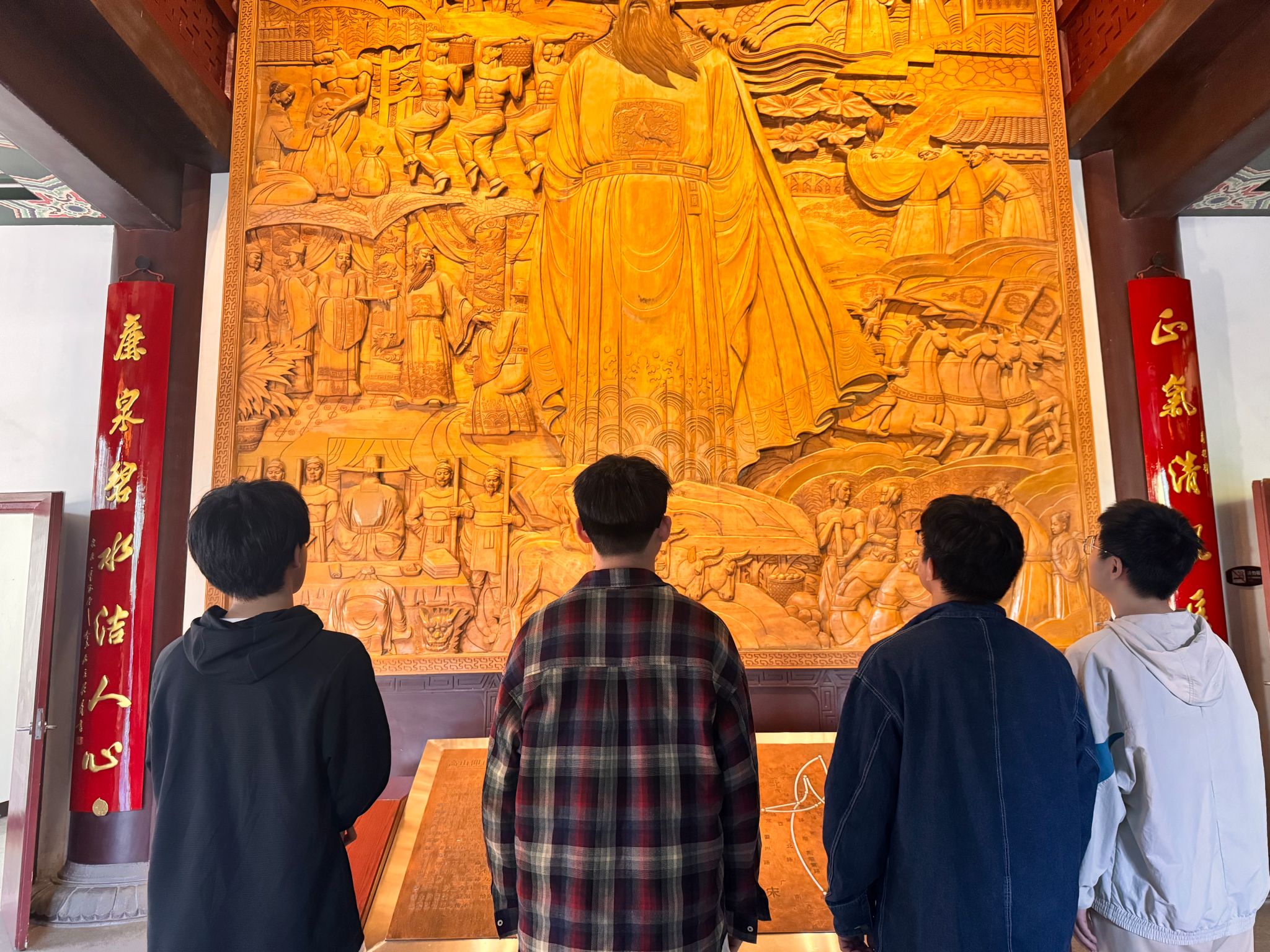 同学们依次参观了包公祠、清风阁等主题场馆。在镌刻着“后世子孙仕宦,有犯赃滥者,不得放归本家”的家训石刻前,同学们长久驻足,深刻体会到包公清心直道、廉洁自律的家风传承,祠内陈列的包公历史文物与塑像,生动再现了其铁面无私、刚正不阿的形象。在清风阁中,同学们通过观看丰富的史料和现代化的展陈技术,系统了解包公清正廉明、执法如山的一生。从“不持一砚归”的典故到“铡美案”的传奇,包公的事迹不再是书本上遥远的故事,而是化为了可感、可触的鲜活教材。