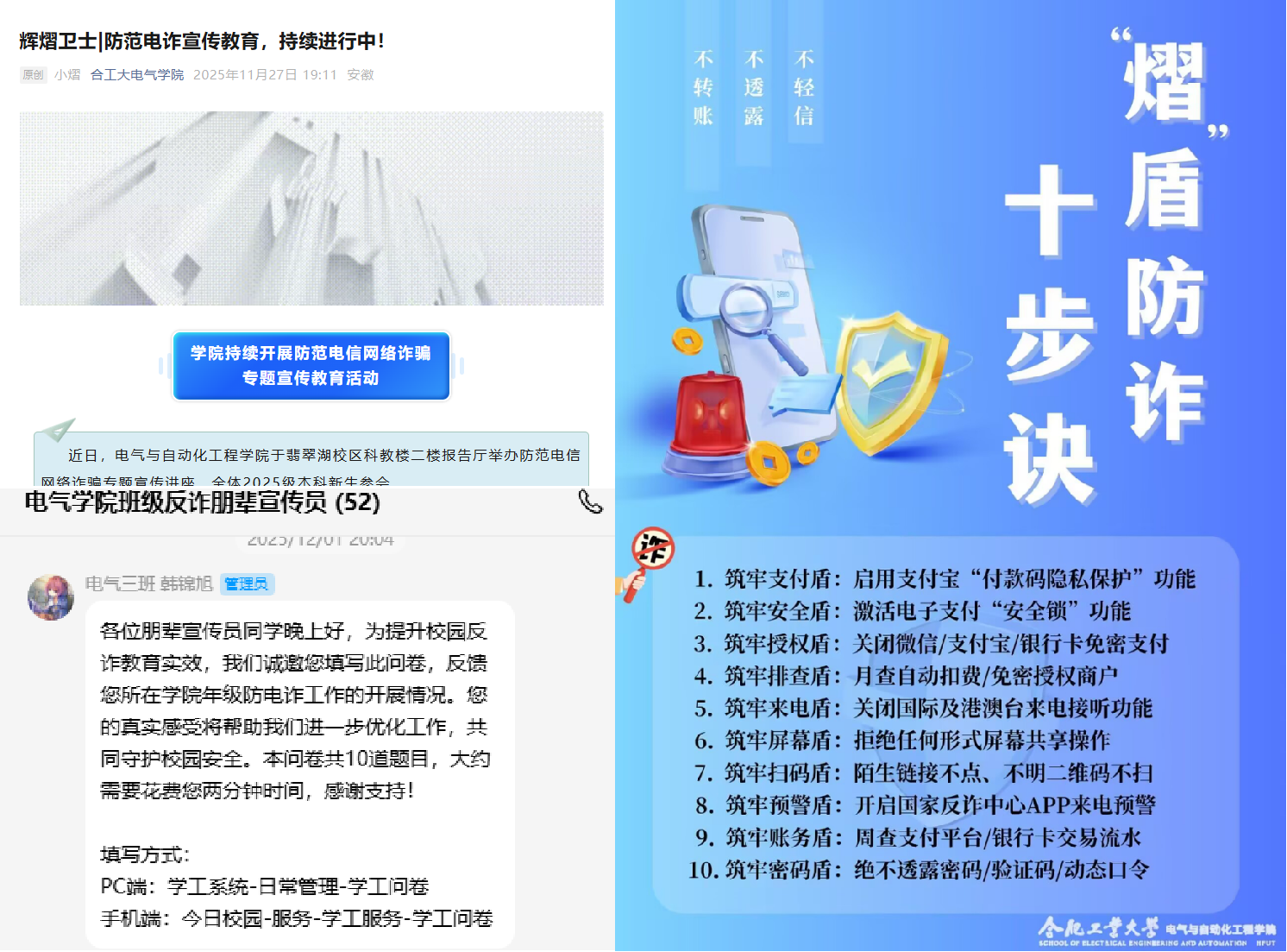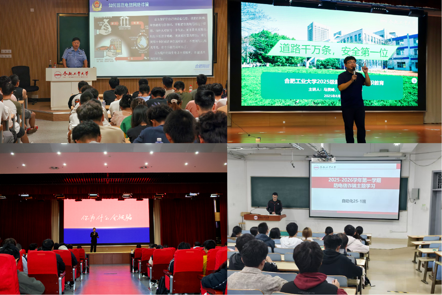集中赋能,全员覆盖教育。9月初,学院开展安全专题系列主题教育,为新生筑牢入学安全防线。日常工作中,辅导员依托主题班会,实现每月对全体学生的常态化宣传覆盖。9月-11月期间,学院分别在屯溪路、翡翠湖校区特邀合肥市公安局刑侦支队警官,举办2场专题专家讲座,警官们从反诈思路、实操举措、受骗心理等维度,结合真实案例进行系统授课。本学期集中教育实现全体学生多轮次覆盖,秋季学期电信网络诈骗案发率较以往明显降低。