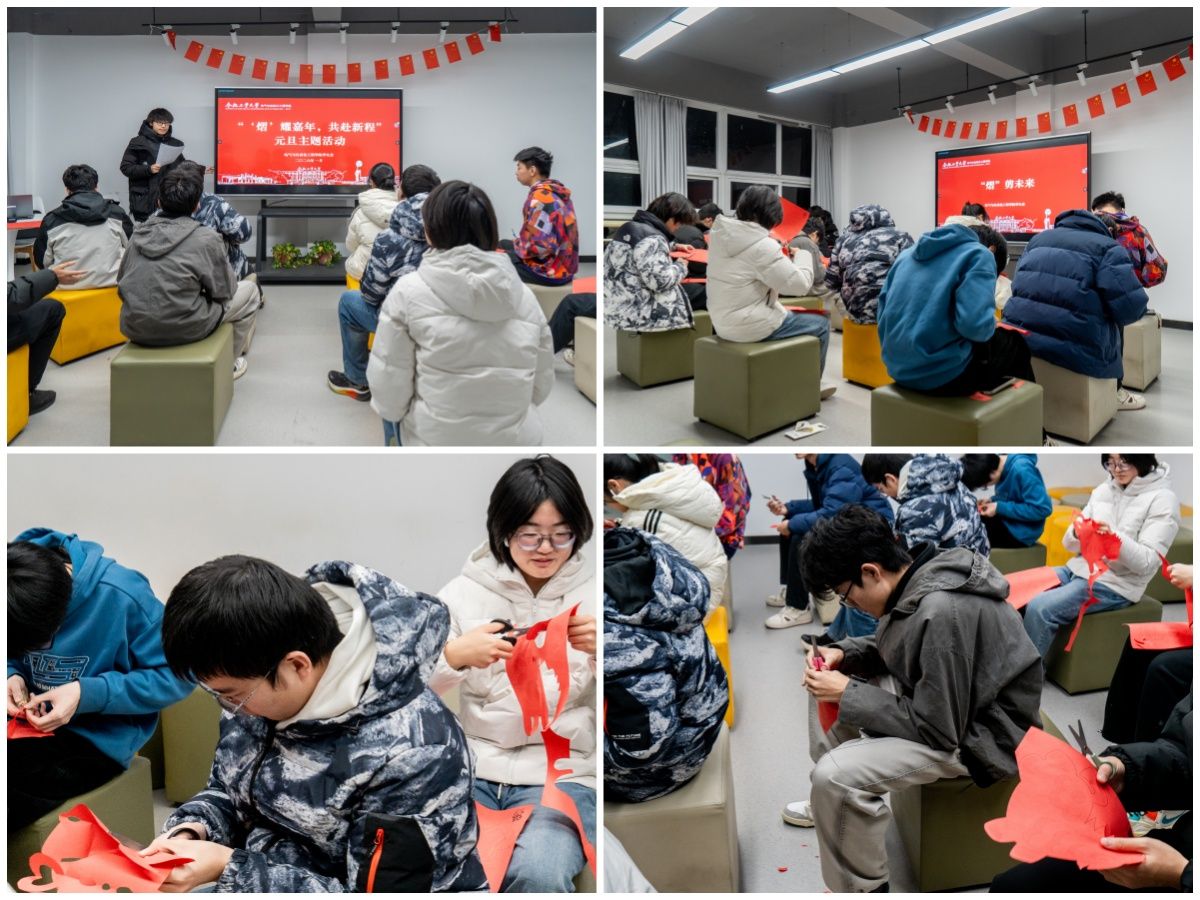 活动伊始,主持人以PPT解读元旦文化渊源:从古代历法新年开端到承载时序更替、祈愿新生的内涵。结合剪窗花手工艺,详解其吉祥祈福寓意,让同学们明晰元旦与传统文化的深厚联结。剪窗花实践环节氛围热烈,现场备好红纸、剪刀等工具,同学们在动手创作中体验传统技艺,折叠、勾勒、裁剪间,一张张红纸化作寓意吉祥的福字、花鸟、生肖纹样。大家互赏作品、交流技巧,让校园社区洋溢着浓浓的年味儿与文化气息。