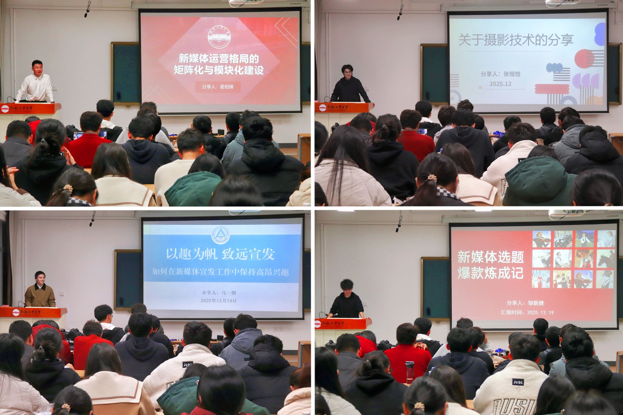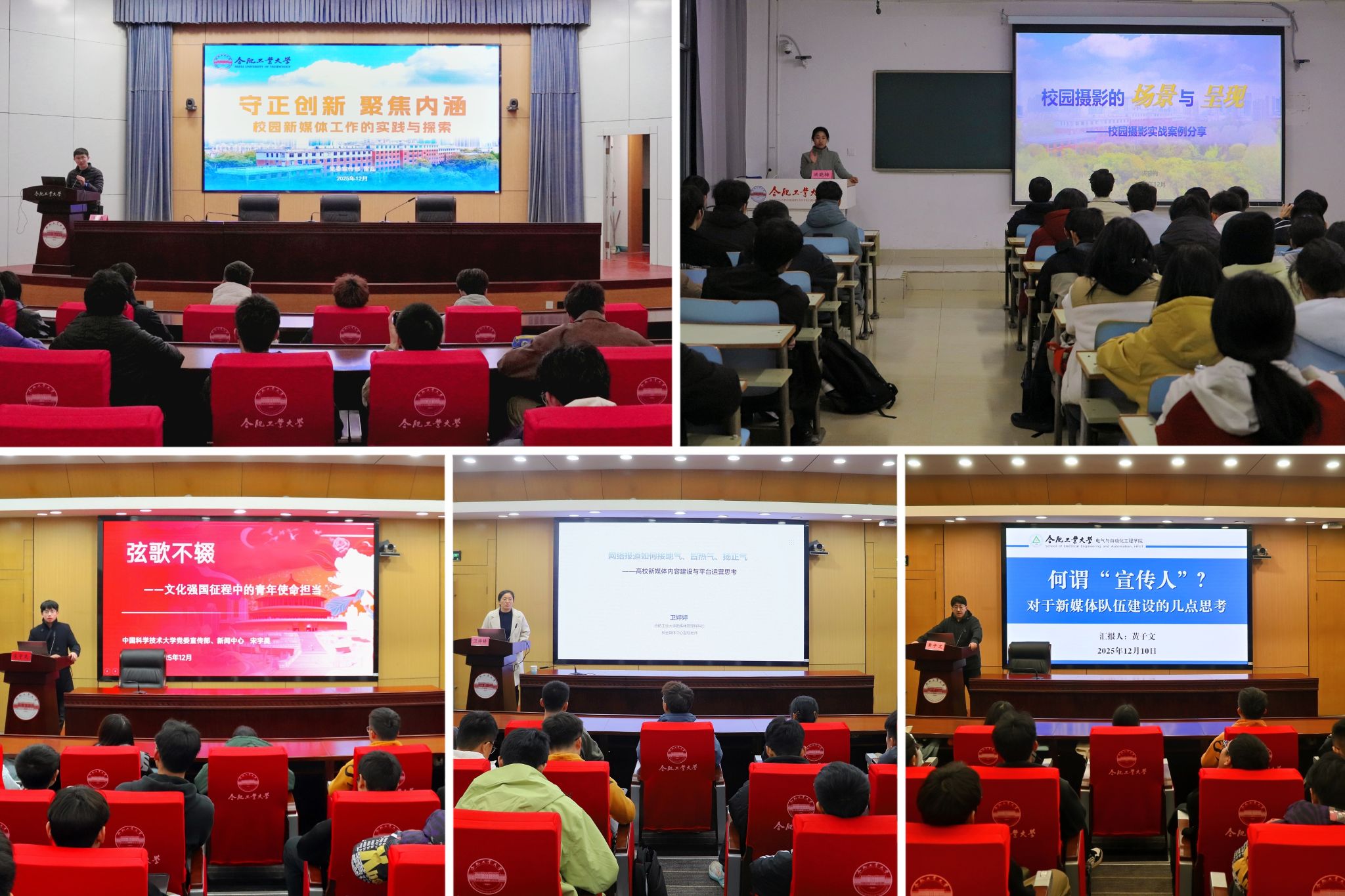 专题研修,筑宣传基础。校党委宣传部融媒体管理科科长卫婷婷、校党委宣传部新闻采编科科长雷磊、校党委学生工作部智慧学工科科长洪晓梅、中国科学技术大学党委宣传部宋宇昊、电气学院新媒体指导教师黄子文围绕宣传工作要求、新媒体队伍建设、运营提质增效、摄影摄像技法、校园文化传播等内容作主题报告,通过系统讲解与实例剖析,为宣传骨干提供全方面的专业教学。