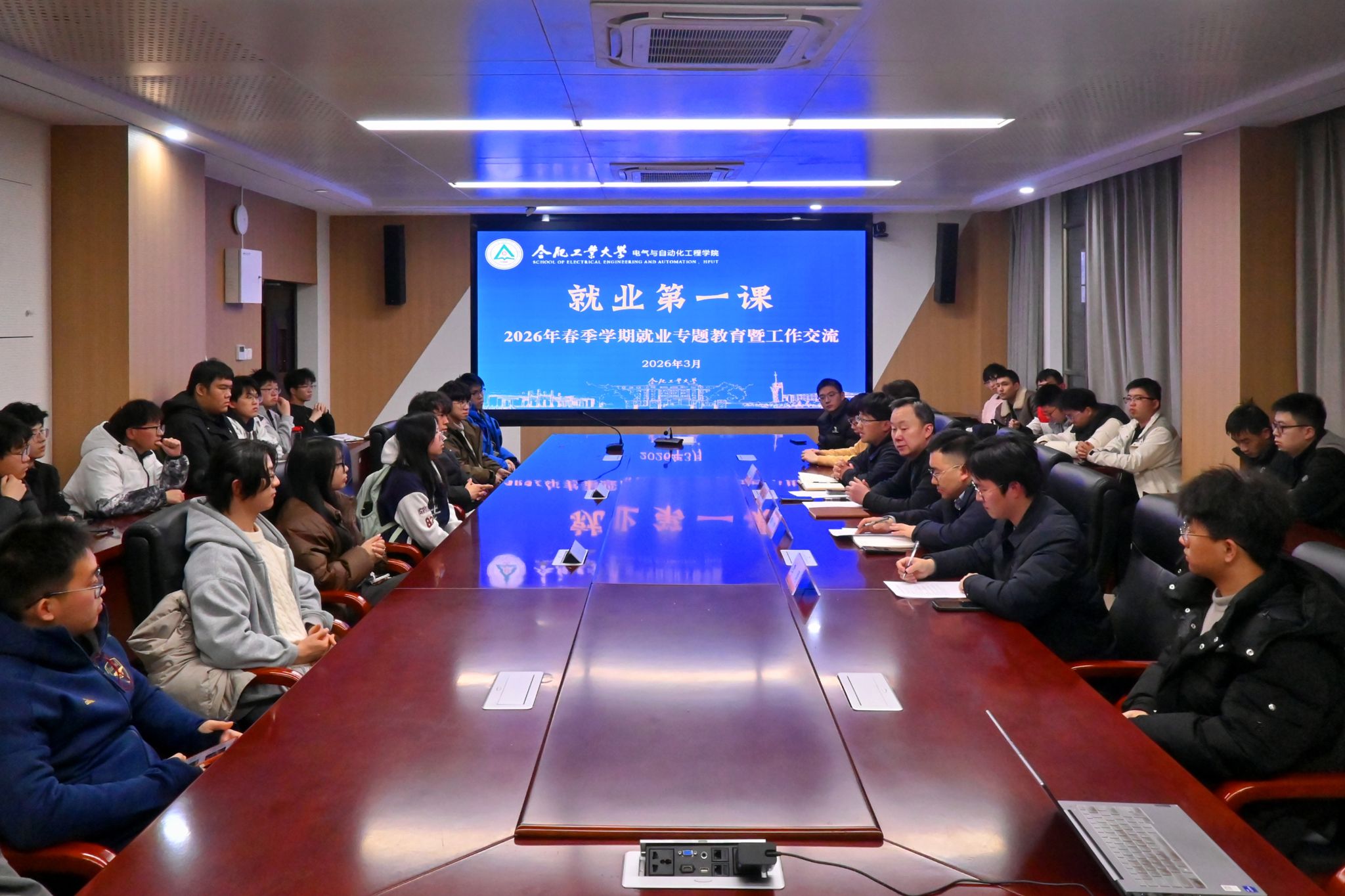 于逸夫楼1009会议室开展2026年度“就业第一课”专题教育,校招生与就业处、学院相关负责教师、各年级拟就业学生参加。