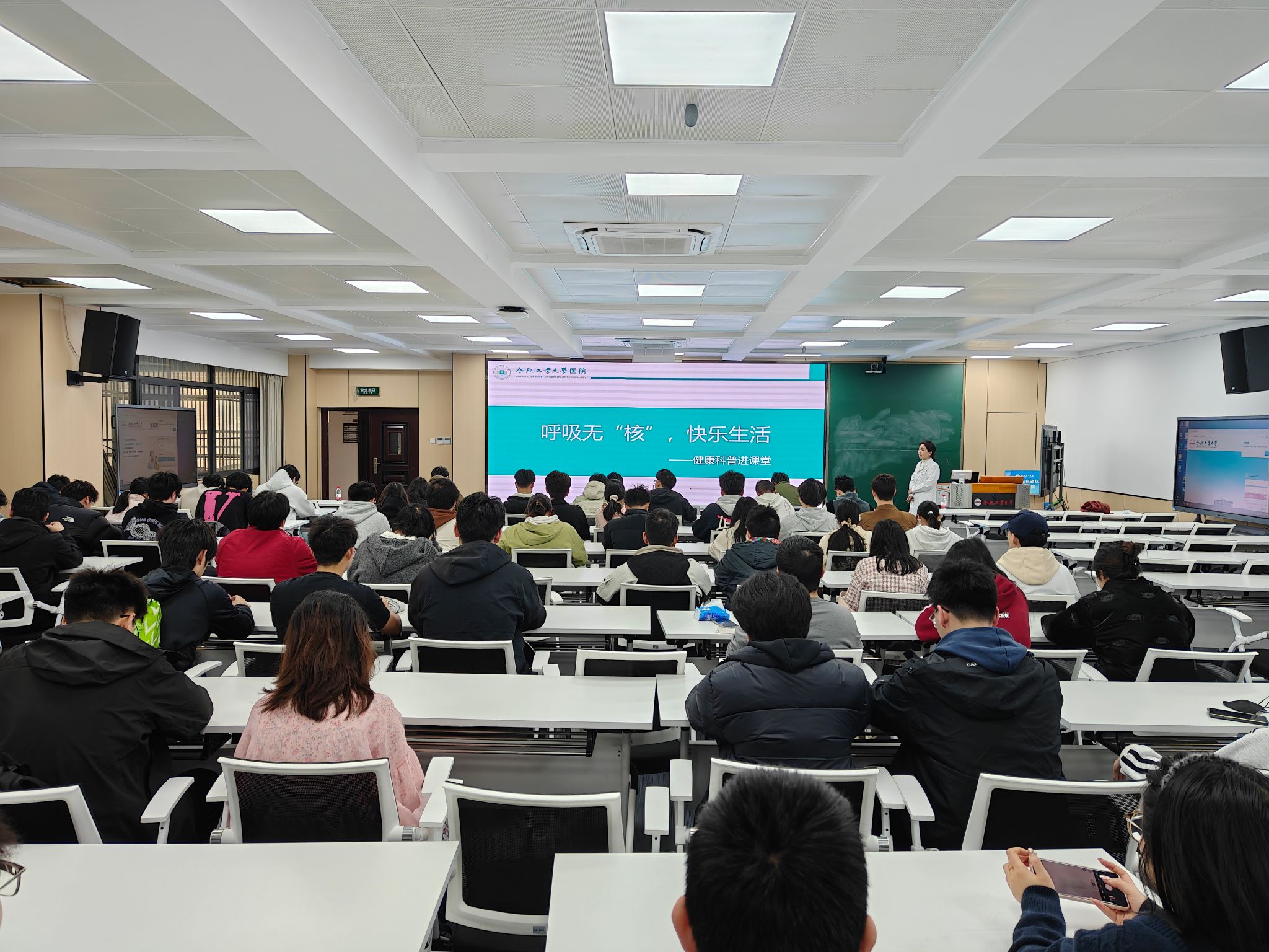 在逸夫楼1005教室举办了“呼吸无‘核’,快乐生活”健康科普专题讲座。本次讲座由校医院吴红花老师主讲,学院本硕各年级学生代表参加活动。